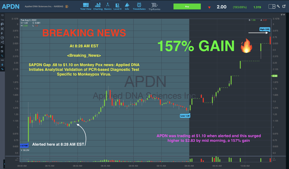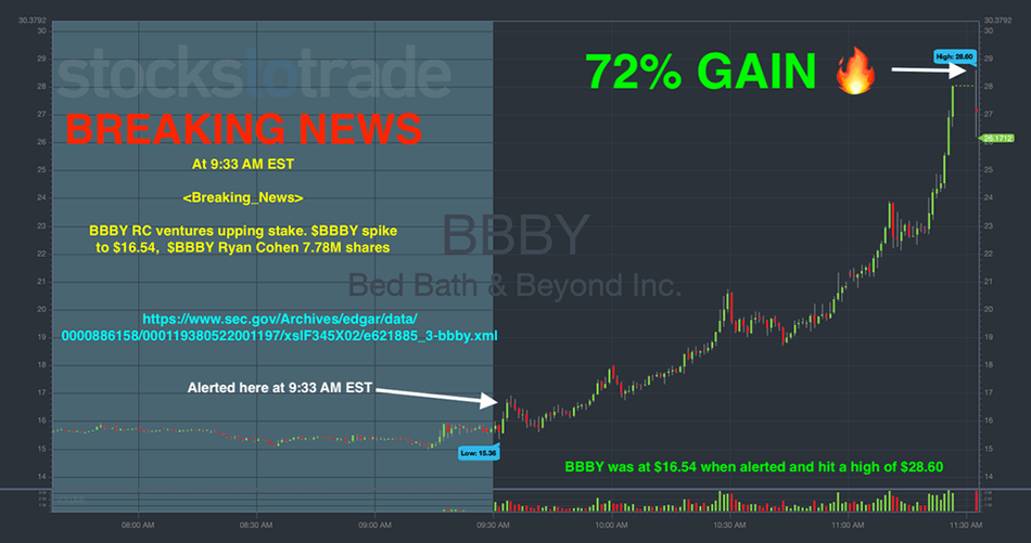 For example on this chart, BBBY, no human being would’ve seen the massive spike coming on Bed Bath and Beyond, but our Algorithm picked it before it ran.